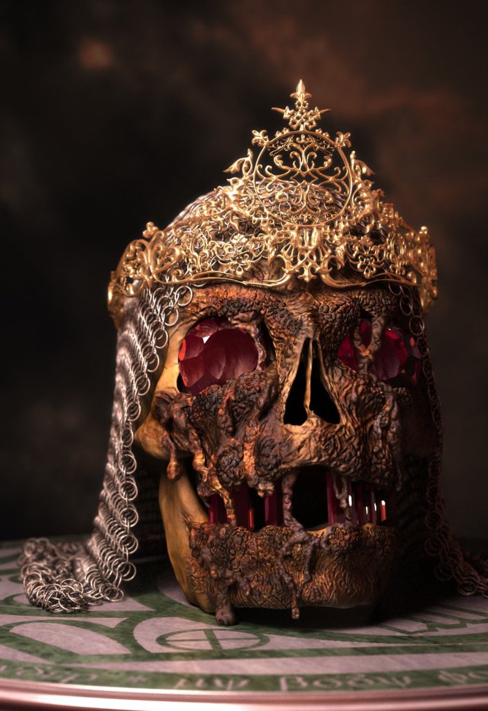 Fiadh’s skull with rubies inset into its eye sockets. Can hover and speak, found on a stone plinth in the tower’s undercroft.