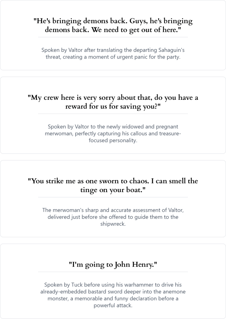 Their voyage was interrupted by a grim discovery: a slain merman floating in the water. Nearby, a merwoman was desperately fighting off two red-scaled, shark-like humanoids known as Sahaguin. Springing into action, Andy loosed a single, perfect arrow that instantly killed one of the assailants. The other fled, vowing to return with demons. After a callously-phrased inquiry about a reward from Valtor, the grieving merwoman offered to lead them to a shipwreck as thanks.