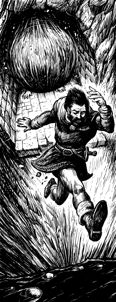 Exploring a western passage, Paddock and Wolf triggered a deadly trap. A giant boulder dropped from the ceiling, rolling down the hall and squashing both of them into unconsciousness. After a frantic healing effort in the dark, they recovered a masterwork warhammer from the crushed remains of a previous victim. The group pressed on, discovering hidden murals with cryptic diabolic messages about a white-masked figure and a ‘Black God’s wrath.’
