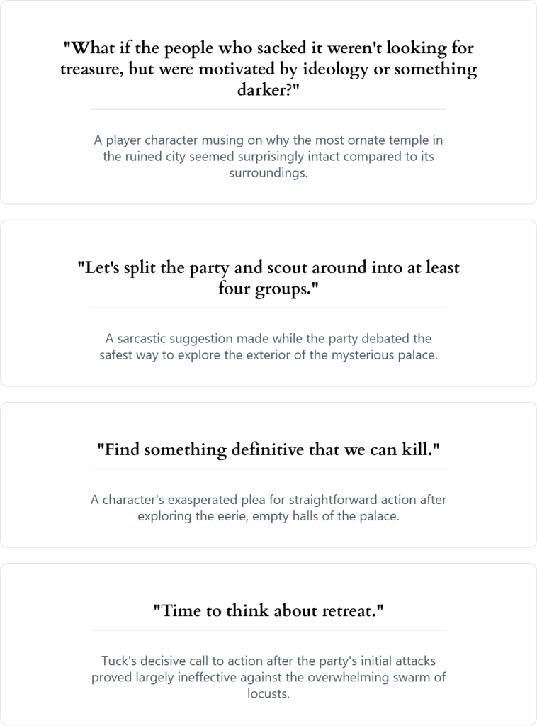 They found themselves behind an altar that had a curious, spherical depression, as if an orb like the one depicted on the stained glass was missing. Moving on, they entered a chamber with pools of crystal-clear water, a stark contrast to the grime covering every other surface. A low buzzing filled the air. As Tuck dipped a flask into the pure water, the buzzing intensified, and swarms of bloated black locusts erupted from the pockmarked walls. The creatures swarmed the party, their bites draining their vitality. After a brief but terrifying exchange, the group fled through the chamber to a door on the far side. In the next room, a library, they discovered a swollen purple pustule on the ceiling, which Andy promptly shot with an arrow, bursting it open. A thorough search of the library yielded books, a silver dagger, religious icons, mirrors, and two heavy stone tablets, one of which was covered in magical script. With their inventory full and the dangers of the palace apparent, the party decided to retreat and return to civilization.