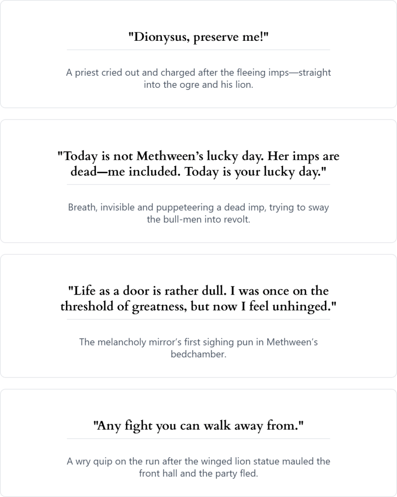 - Bat-Winged Imps: Red-skinned, horned servitors who collected blood for Methween’s rituals. They tried flattery and flight, but were slept and slain.