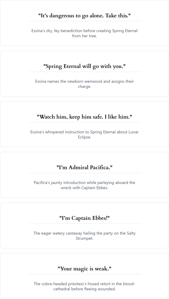 - Essina: An ancient weirwood guardian whose sense of time is as deep as her roots. She taught the Tide Stones’ rite and created Spring Eternal to aid the party, hinting at centuries of watching the island ebb and sour.