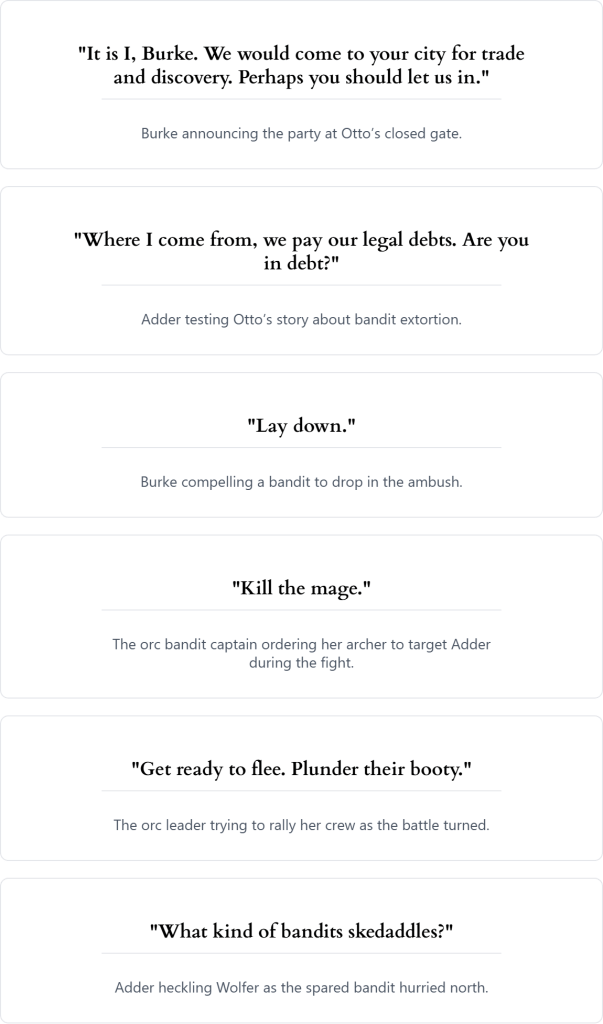 The group agreed to help. They kept watch through a wind-scoured night, then at dawn Tacho slipped into the woods and caught the faint scent of cold smoke to the southwest. Following the sign, they found a well-hidden camp of four bandits. The party sprang an ambush: Hapii surged forward and dazed the orc leader with a fey touch, Burke stepped from the brush and compelled one bandit to lay down his arms, and Adder’s crackling, geometric blast erased another. Tithro’s chain blade whirled and bit. The orc captain cut Tacho down with a brutal stroke before Adder punched a smoking hole through her, ending the fight.