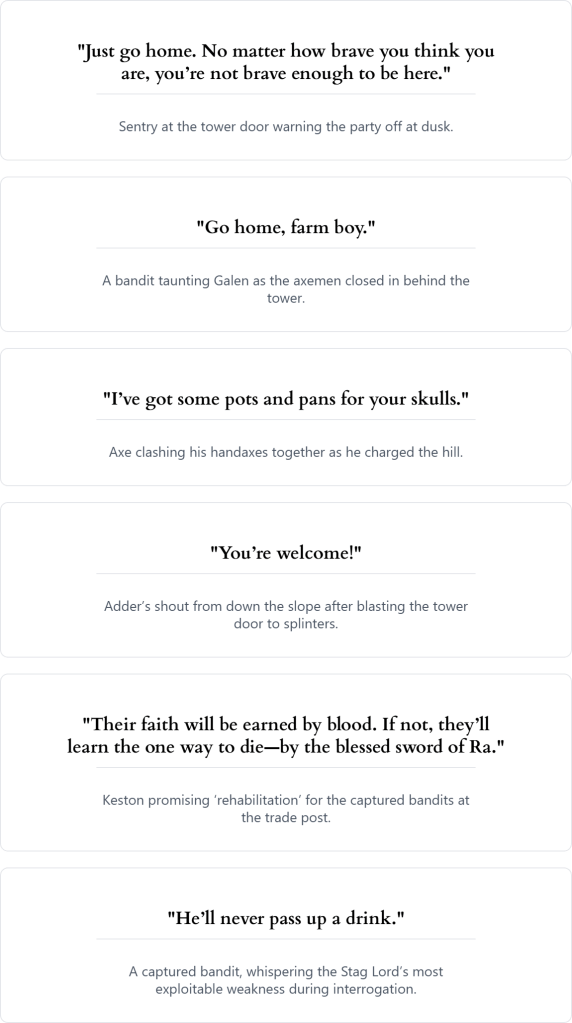 - Two axemen flanked the tower’s base and dropped Galen; Izzy reached him and revived him with a quick draught.