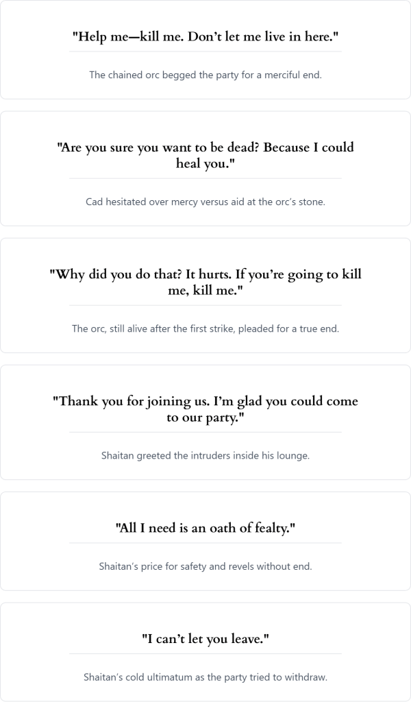 - Shaitan’s Lounge: A fog‑lit revel hall of couches, silver platters of fruit, a wine ewer, and three nymph archers. Shaitan played his pipes here and demanded oaths.