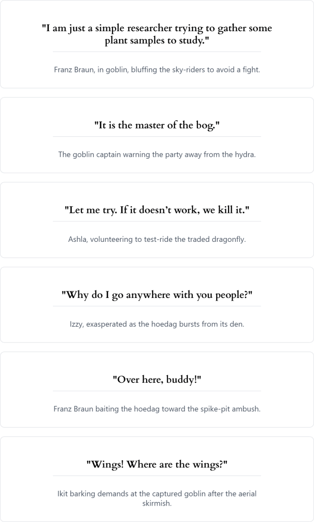 - In the bogs they parleyed with goblin sky‑riders, traded two boggard skull helms for a dragonfly mount named Biter, and learned to avoid the many‑headed master of the bog.