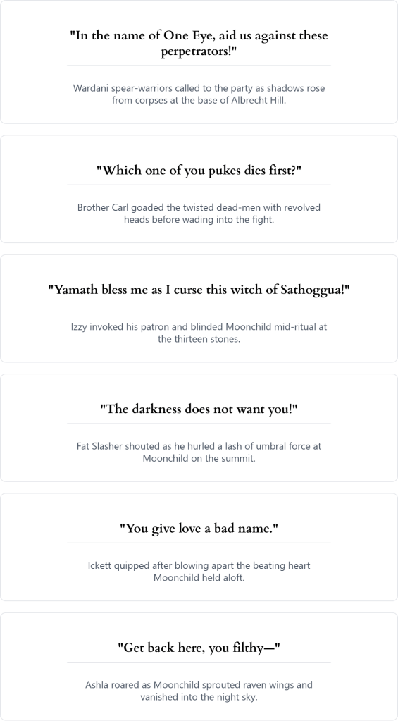 Near the summit, three branded dead-men met them with owl-swiveled heads as the moon vanished entirely. The brands flared when pierced, shrugging off mortal wounds, until Ickett blew an arm—and its brand—clean away. Shaken, the Wardani fled. The party reached a ring of thirteen menhirs and a bonfire where a red-haired woman—Moonchild—held a beating heart aloft above a second redhead, her identical twin, butchered on the altar. She proclaimed herself a triune god and called to the darkness, but Izzy blinded her and Fat Slasher’s shadow-blast staggered her. Ickett shot the heart to pieces.