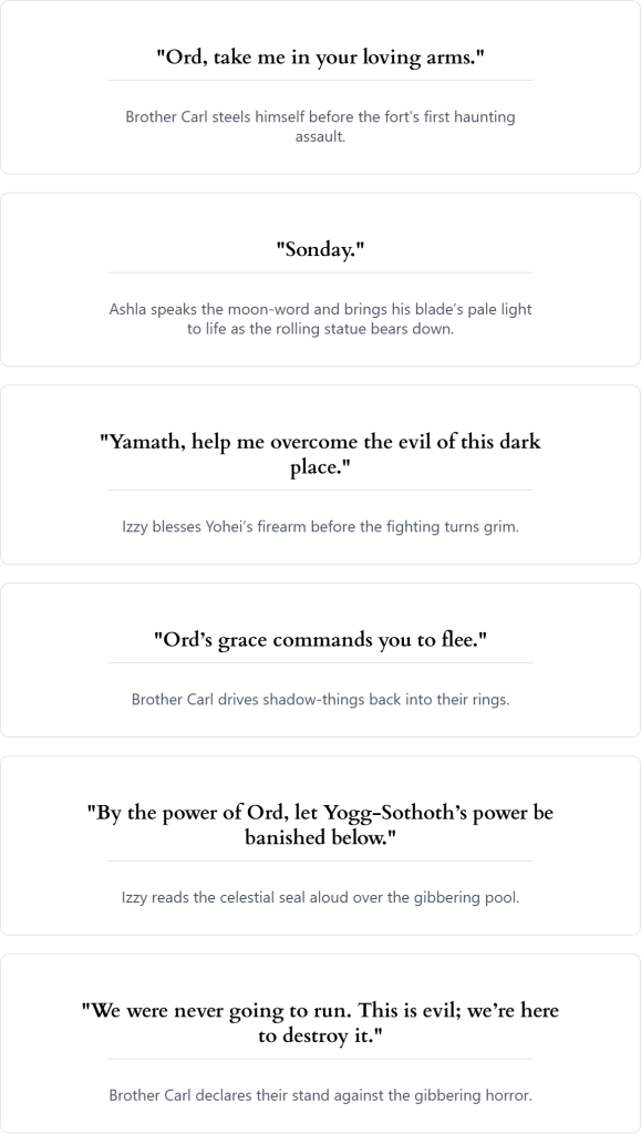 - Brother Carl: A lawful cleric of Ord and a battlefield surgeon whose faith burns hottest against the undead. He smashed wisps, turned shadow‑things twice with unshakable conviction, and even lanced darkness apart to save the retreat. Afterward, he prayed hard over seals and sins, and sees Lantern Fort as a place that must be cleansed.