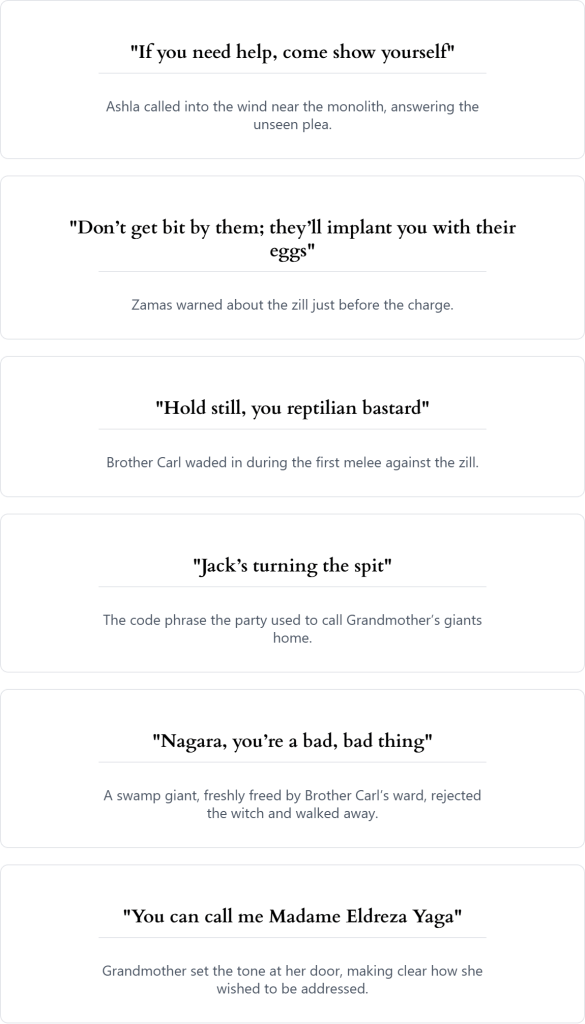 They found Grandmother in the western Bottoms: a bright little hut, a wicker man named Jack turning a roasting boar on a spit, and two mossy giant “hummocks.” The door flew open to Madame Eldreza Yaga, sharp as a thorn and unimpressed with petitions. She promised the means to fix Kell-Singer if they recovered her “children,” the swamp giants Gunbad and Snogark, from the rival witch Nagara in the eastern Bottoms. They slept in her uncanny, far‑larger‑inside home; she pegged the wand as a maker’s rod and the tome as a dwarvish spellbook, and muttered of the monolith’s fall centuries past.