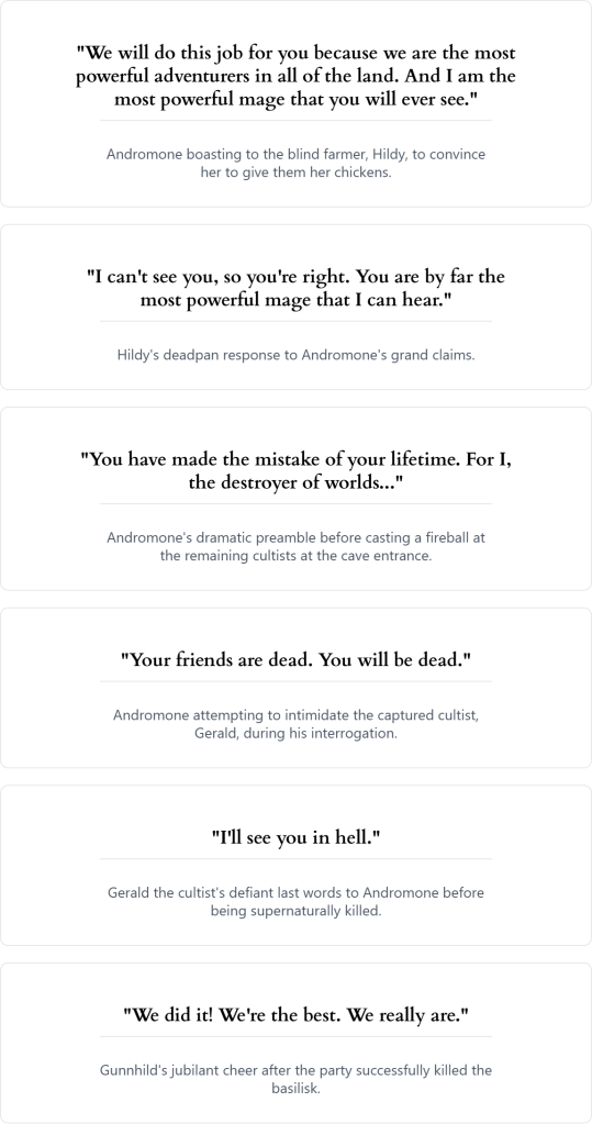 Upon reaching the cave, the party was immediately ambushed by three black-robed mallard cultists invoking the name of Sothmog. After a fierce battle where Theoline was gravely wounded, Andromone’s devastating fireball turned the tide. Pressing deeper, they discovered five more blindfolded cultists, whom they managed to ambush and subdue, keeping one alive for questioning. The captive, Gerald, revealed they also sought an ‘idol’ from the basilisk’s horde—another piece of the statuette—before he was mysteriously struck dead by some unseen force.