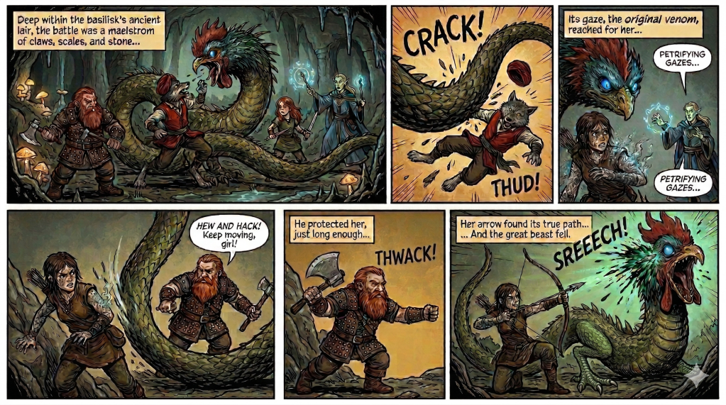 Joining forces with Gunnhild, whom they found just outside the final chamber, the party prepared for the main event. They tossed the chickens into the lair to distract the monstrous basilisk, a terrifying hybrid of rooster and snake. The ensuing battle was chaotic and perilous. The beast’s sweeping tail and petrifying gaze proved deadly, knocking Lunarium unconscious and nearly turning Theoline to stone. In a spectacular display of marksmanship, Theoline, recovering from the gaze, fired an armor-piercing arrow that found the basilisk’s eye, felling the great beast for good.