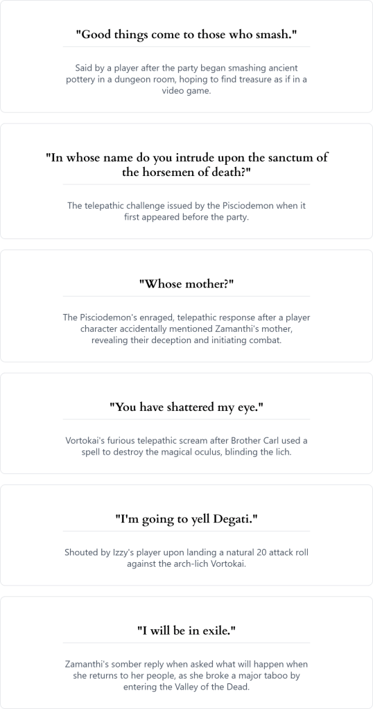 The centaur was alive but cursed, her rear legs paralyzed by the dungeon’s master, a skeletal wizard named Vortokai. Brother Carl used a precious and ancient Scroll of Restoration to lift the curse, and the grateful Zamanthi joined their cause. Their exploration led them past a horrifying cavern with a lake of bubbling tar before they discovered a hidden embalming room. Solving a puzzle within, Brother Carl cast a spell that shattered a great magical eye, an act which summoned the enraged arch-lich Vortokai himself. In the tight corridors, they fought a desperate battle against the powerful undead spellcaster. Though they wounded him gravely, the lich escaped into shadow, leaving the battered adventurers to barricade themselves in for a much-needed rest.