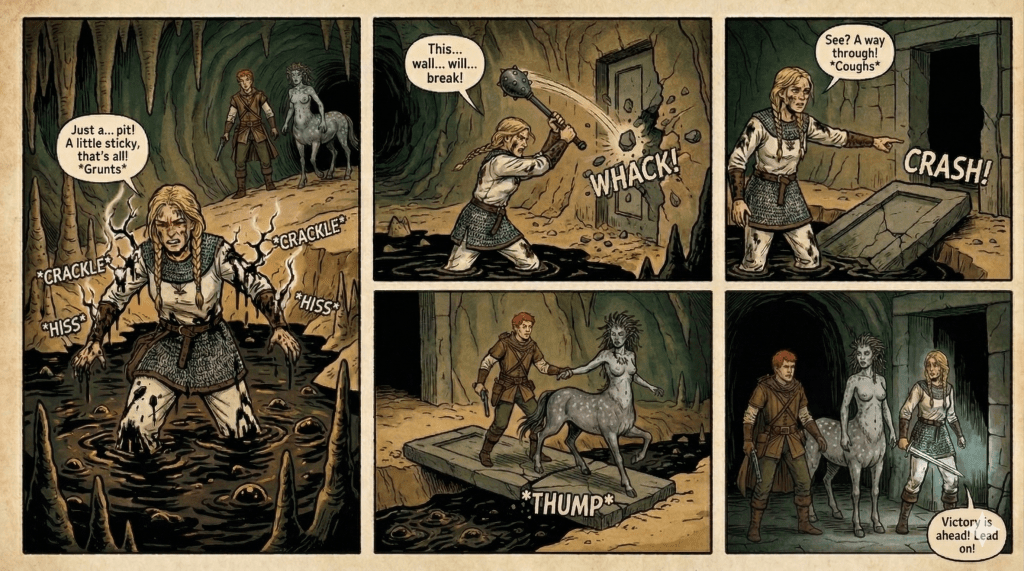The Owlbear Adventurers awoke in the funerary room of Vorodokai’s tomb to find Brother Carl had vanished, leaving only a cryptic note scribbled on the wall. Pressing onward, they came to a large chamber dominated by a bubbling tar pit. Across the chasm, a skeletal guardian in tattered robes warned them not to cross by order of Vorodokai. When asked for an exit, the guardian pointed to a faint crack in the wall, accessible only by traversing the scorching tar. Ashla bravely charged through the searing pit, taking heavy damage before smashing open the hidden stone door with her mace.