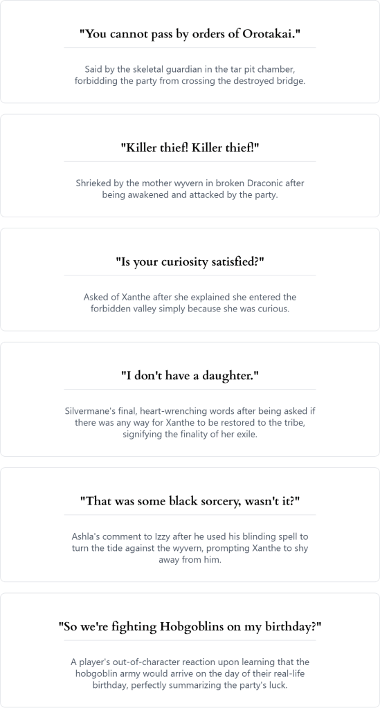 Searching the nest, they discovered the remains of a Hell Knight, clad in black adamantine plate mail and clutching a magic warhammer that dripped blood. After retrieving their gear from the base of the cliff, the party escorted Xanthe back to her village. There, they were greeted by her mother, the chieftain Silvermane. While overjoyed at her daughter’s safe return, Silvermane was bound by tradition. She formally exiled Xanthe for her transgression of entering the sacred Valley of the Dead. In exchange for rescuing her daughter, however, Silvermane forged a powerful alliance, declaring the adventurers friends of the herd. The session concluded with the party’s return to Fort Owlbear, where they learned a hobgoblin army was marching toward them, setting the stage for an imminent invasion.